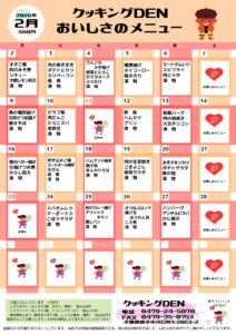 寒さの厳しい日が続いておりますが、いつもクッキングDENをご利用いただき、ありがとうございます。 クッキングDENでは2月も、からだを温め、ほっとできるような栄養バランスのとれた手作りのお弁当を心を込めてお届けしてまいり […]